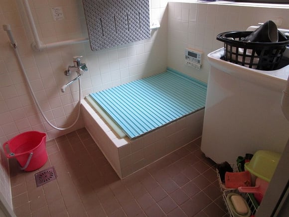 広さは1坪程の浴室ですが、スペースに洗濯機が設置されていました。