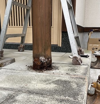 沓石を外してみると、水と白蟻による腐食を確認したのです。