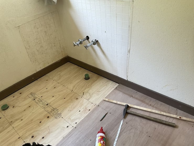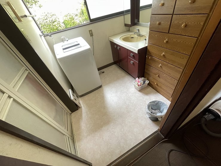 新しいクッションフロアを張って、洗濯機・洗面台・収納棚を戻して完成です。